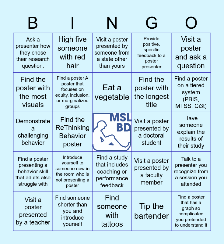 This bingo card has a free space and 24 words: Visit a poster presented by a teacher, Introduce yourself to someone new in the room who is not presenting a poster, Eat a vegetable, Tip the bartender, Visit a poster and ask a question, Ask a presenter how they chose their research question., High five someone with red hair, Visit a poster presented by someone from a state other than yours, Visit a poster presented by a doctoral student, Have someone explain the results of their study, Demonstrate a challenging behavior, Find a poster A poster that focuses on equity, inclusion, or marginalized groups, Visit a poster presented by a faculty member, Talk to a presenter you recognize from a session you attended, Find the poster with the most visuals, Find someone shorter than you and introduce yourself, Find someone with tattoos, Provide positive, specific feedback to a poster presenter, Find a poster on a tiered system (PBIS, MTSS, Ci3t), Find a poster presenting a behavior skill that adults also struggle with, Find the ReThinking Behavior poster, Find a study that includes coaching or performance feedback, Find the poster with the longest title and Find a poster that has a graph so complicated you pretended to understand it.
