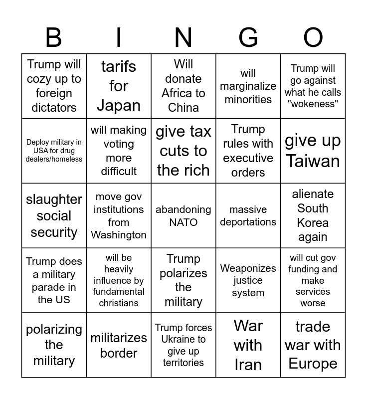 This bingo card has a free space and 27 words: Weaponizes justice system, creates MAGA civil service, Trump rules with executive orders, Trump forces Ukraine to give up territories, Deploy military in USA for drug dealers/homeless, Will donate Africa to China, tarifs for Japan, Trump does a military parade in the US, massive deportations, will cut gov funding and make services worse, slaughter social security, will marginalize minorities, polarizing the military, militarizes border, give up Taiwan, abandon green transition, will making voting more difficult, give tax cuts to the rich, will be heavily influence by fundamental christians, Trump will cozy up to foreign dictators, alienate South Korea again, War with Iran, move gov institutions from Washington, trade war with Europe, Trump polarizes the military, Trump will go against what he calls "wokeness" and Russia, Russia, Russia.