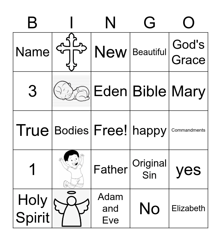This bingo card has 5 images, a free space and 23 words: yes, God, Bible, No, 3, New, 1, happy, Holy Spirit, True, Beautiful, Adam and Eve, Mary, Christmas, Eden, Father, Name, Gabriel, Elizabeth, Bodies, Commandments, Original Sin and God's Grace.