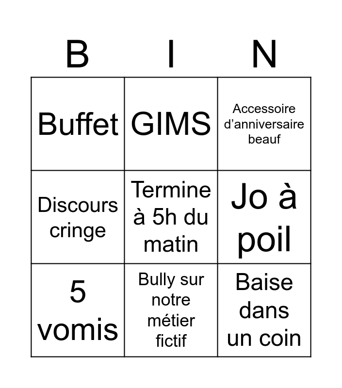 This bingo card has a free space and 8 words: Jo à poil, Accessoire d’anniversaire beauf, GIMS, 5 vomis, Buffet, Baise dans un coin, Discours cringe and Bully sur notre métier fictif.