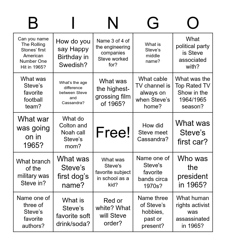 This bingo card has a free space and 24 words: What was Steve’s first dog’s name?, What is Steve’s favorite soft drink/soda?, What was the highest-grossing film of 1965?, Name one of three of Steve’s favorite authors?, What political party is Steve associated with?, Can you name The Rolling Stones’ first American Number One Hit in 1965?, What was Steve’s favorite football team?, How do you say Happy Birthday in Swedish?, How did Steve meet Cassandra?, What was Steve's favorite subject in school as a kid?, What cable TV channel is always on when Steve’s home?, What war was going on in 1965?, Name one of Steve's favorite bands circa 1970s?, Who was the president in 1965?, What’s the age difference between Steve and Cassandra?, Name three of Steve’s hobbies, past or present?, What was Steve’s first car?, Name 3 of 4 of the engineering companies Steve worked for?, What was the Top Rated TV Show in the 1964/1965 season?, What do Colton and Noah call Steve’s mom?, What human rights activist was assassinated in 1965?, What branch of the military was Steve in?, What is Steve’s middle name? and Red or white? What will Steve order?.
