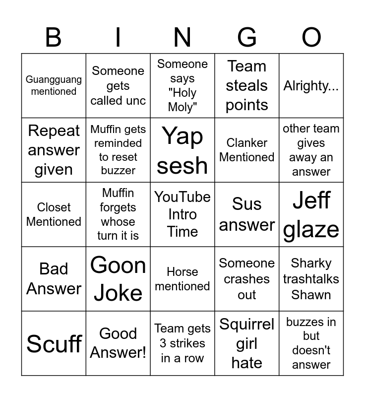 This bingo card has a free space and 24 words: Goon Joke, Good Answer!, Yap sesh, Scuff, Alrighty..., Guangguang mentioned, Repeat answer given, Someone gets called unc, Sus answer, Horse mentioned, Clanker Mentioned, Closet Mentioned, Someone crashes out, Sharky trashtalks Shawn, Muffin gets reminded to reset buzzer, Squirrel girl hate, Jeff glaze, Someone says "Holy Moly", other team gives away an answer, Muffin forgets whose turn it is, buzzes in but doesn't answer, Bad Answer, Team steals points and Team gets 3 strikes in a row.