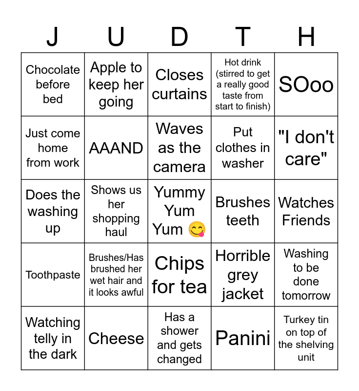 This bingo card has a free space and 32 words: Panini, Turns off the lights, Shows us her shopping haul, Bottle of pop, Toothpaste, AAAND, SOoo, Washing to be done tomorrow, Apple to keep her going, Pathetic excuse for a salad, Waves as the camera, Closes curtains, Not at work tomorrow, We see her tongue, Brushes teeth, Bread and butter for tea, Watching telly in the dark, Does the washing up, Chips for tea, Brushes/Has brushed her wet hair and it looks awful, Horrible grey jacket, Watches Big Bang Theory, Watches Friends, Cheese, Turkey tin on top of the shelving unit, Hot drink (stirred to get a really good taste from start to finish), Put clothes in washer, Just come home from work, Chocolate before bed, Has a shower and gets changed, Pizza and "I don't care".