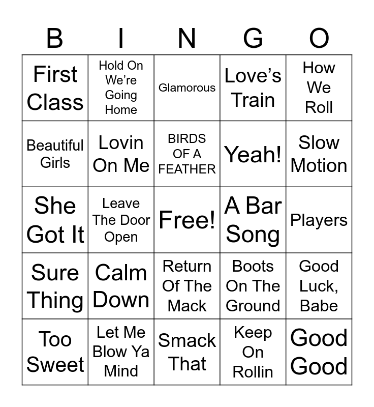 This bingo card has a free space and 58 words: Needed Me, Let Me Blow Ya Mind, 1,2 Step, Sure Thing, Keep On Rollin, Wake Up In The Sky, Lovin On Me, Taste, Yeah!, Take It To The House, Love’s Train, Regulate, Family Affair, Main One, luther, First Class, Good Good, How We Roll, APT., BIRDS OF A FEATHER, A Bar Song, Glamorous, Too Sweet, Good Luck, Babe, Time of Our Lives, Players, No Guidance, Give Me Everything, Slow Motion, I Wanna Love You, Fireball, Hypnotize, Magic Stick, Young, Wild & Free, Bartender, Fat Juicy & Wet, Broadway Girls, Leave The Door Open, She Got It, WHISKEY WHISKEY, Calm Down, No Diggity, Boots On The Ground, Boyfriend, Weak, Suga Suga, Big Poppa, Return Of The Mack, Smack That, California Love, Me & U, Low, Run It!, Hit ‘Em Up Style, Hold On We’re Going Home, Work It, Beautiful Girls and Pony.