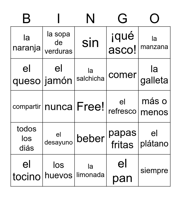 This bingo card has a free space and 24 words: el desayuno, los huevos, la salchicha, el tocino, la manzana, la naranja, el queso, la sopa de verduras, el refresco, beber, comer, compartir, papas fritas, el plátano, el jamón, el pan, más o menos, sin, la galleta, nunca, siempre, todos los diás, ¡qué asco! and la limonada.