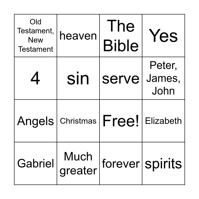 This bingo card has 22 words: Much greater, Die, heaven, nothing, sin, serve, Old Testament, New Testament, The Bible, Free!, spirits, Angels, Yes, good, Jesus Christ, forever, choices, Elizabeth, Gabriel, Christmas, 4, Peter, James, John and body.