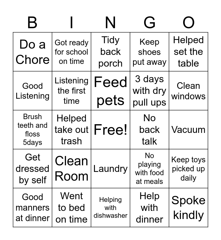 This bingo card has a free space and 24 words: Clean Room, Went to bed on time, Feed pets, Good manners at dinner, Helped set the table, Do a Chore, Good Listening, Got ready for school on time, No back talk, Laundry, 3 days with dry pull ups, Brush teeth and floss 5days, No playing with food at meals, Keep toys picked up daily, Listening the first time, Help with dinner, Vacuum, Tidy back porch, Clean windows, Helped take out trash, Spoke kindly, Get dressed by self, Keep shoes put away and Helping with dishwasher.
