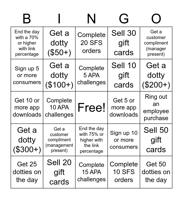 This bingo card has a free space and 24 words: Get a customer compliment (management present), Sell 20 gift cards, Complete 5 APA challenges, Get 25 dotties on the day, Get a customer compliment (manager present), End the day with a 70% or higher with link percentage, Sign up 5 or more consumers, Get a dotty ($50+), Get 5 or more app downloads, End the day with 75% or higher with the link percentage, Sell 10 gift cards, Get 10 or more app downloads, Sign up 10 or more consumers, Sell 50 gift cards, Get a dotty ($100+), Complete 10 SFS orders, Ring out an employee purchase, Complete 20 SFS orders, Get a dotty ($200+), Complete 10 APA challenges, Get 50 dotties on the day, Get a dotty ($300+), Sell 30 gift cards and Complete 15 APA challenges.