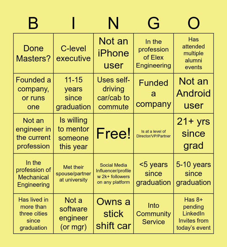 This bingo card has a free space and 25 words: Met their spouse/partner at university, Owns a stick shift car, Uses self-driving car/cab to commute, Has lived in more than three cities since graduation, Has attended multiple alumni events, Done Masters?, Founded a company, or runs one, C-level executive, Is at a level of Director/VP/Partner, Social Media Influencer/profile w 2k+ followers on any platform, Funded a company, Not an engineer in the current profession, <5 years since graduation, 5-10 years since graduation, 11-15 years since graduation, 16-20 yrs since grad, 21+ yrs since grad, Not an iPhone user, Not an Android user, Is willing to mentor someone this year, Has 8+ pending LinkedIn Invites from today’s event, Not a software engineer (or mgr), In the profession of Mechanical Engineering, In the profession of Elex Engineering and Into Community Service.