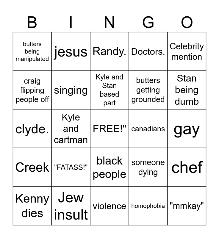 This bingo card has a free space and 24 words: "FATASS!", Jew insult, Kyle and Stan based part, Kenny dies, Celebrity mention, butters being manipulated, craig flipping people off, jesus, canadians, black people, butters getting grounded, clyde., someone dying, chef, singing, homophobia, gay, Randy., Stan being dumb, Kyle and cartman, "mmkay", Creek, Doctors. and violence.