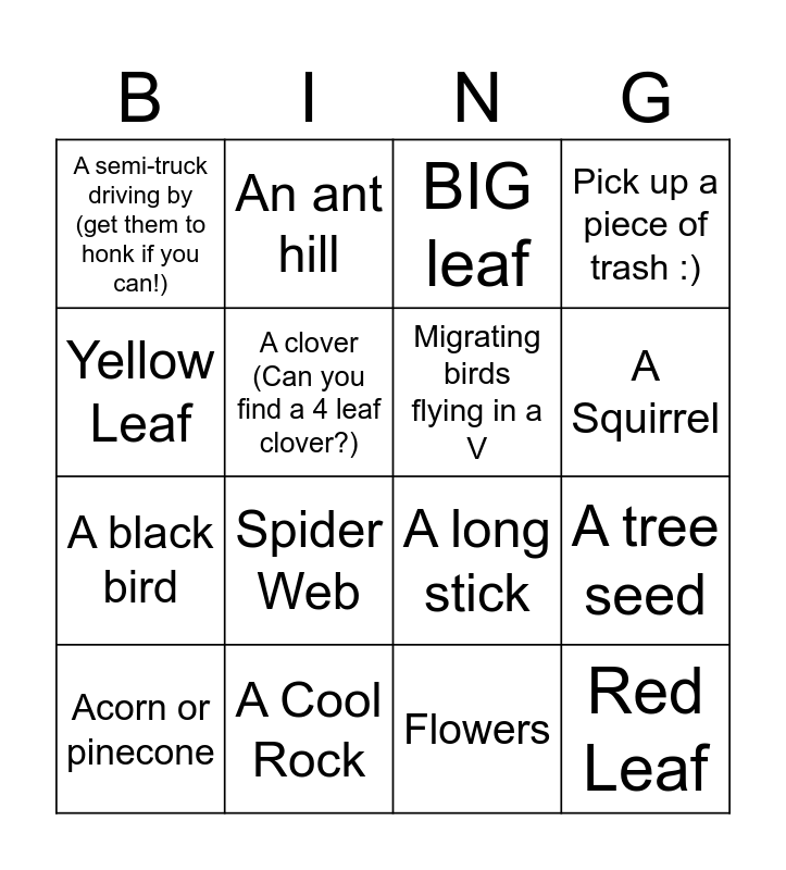 This bingo card has 16 words: A Cool Rock, A tree seed, BIG leaf, A semi-truck driving by (get them to honk if you can!), A black bird, An ant hill, A long stick, Flowers, Yellow Leaf, A clover (Can you find a 4 leaf clover?), Acorn or pinecone, Pick up a piece of trash :), Spider Web, A Squirrel, Migrating birds flying in a V and Red Leaf.