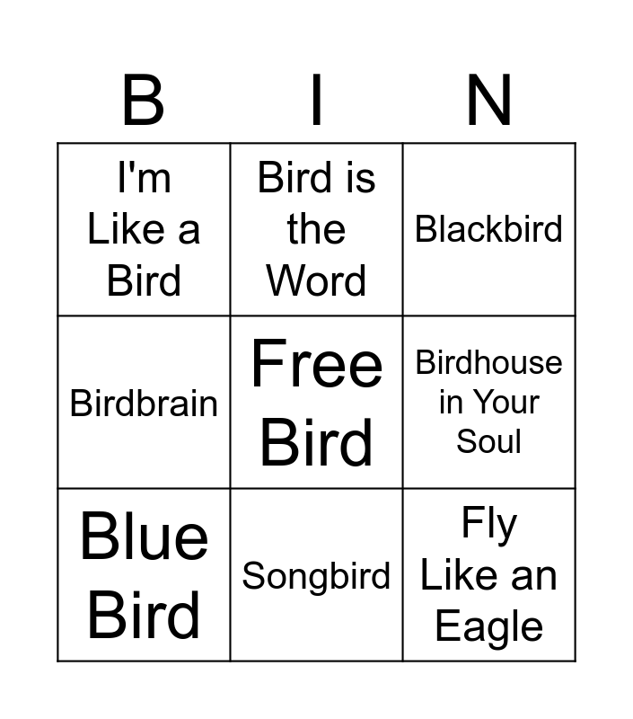 This bingo card has a free space and 8 words: Birdhouse in Your Soul, Blackbird, Bird is the Word, Blue Bird, I'm Like a Bird, Fly Like an Eagle, Birdbrain and Songbird.