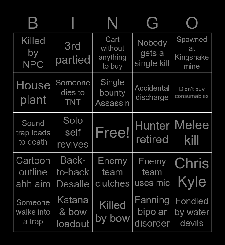 This bingo card has a free space and 25 words: Back-to-back Desalle, Killed by bow, Single bounty Assassin, Someone walks into a trap, Spawned at Kingsnake mine, Killed by NPC, House plant, 3rd partied, Hunter retired, Enemy team clutches, Accidental discharge, Sound trap leads to death, Enemy team uses mic, Chris Kyle, Someone dies to TNT, Suspicious headshot, Melee kill, Cart without anything to buy, Didn't buy consumables, Solo self revives, Fondled by water devils, Katana & bow loadout, Cartoon outline ahh aim, Nobody gets a single kill and Fanning bipolar disorder.