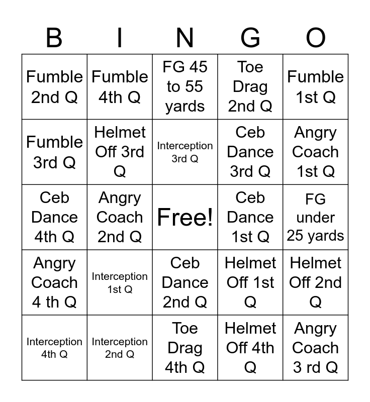 This bingo card has a free space and 24 words: Interception 1st Q, Interception 2nd Q, Interception 3rd Q, Interception 4th Q, Fumble 1st Q, Fumble 2nd Q, Fumble 3rd Q, Fumble 4th Q, Ceb Dance 1st Q, Ceb Dance 2nd Q, Ceb Dance 3rd Q, Ceb Dance 4th Q, Helmet Off 1st Q, Helmet Off 2nd Q, Helmet Off 3rd Q, Helmet Off 4th Q, FG under 25 yards, FG 45 to 55 yards, Angry Coach 1st Q, Angry Coach 2nd Q, Angry Coach 3 rd Q, Angry Coach 4 th Q, Toe Drag 2nd Q and Toe Drag 4th Q.
