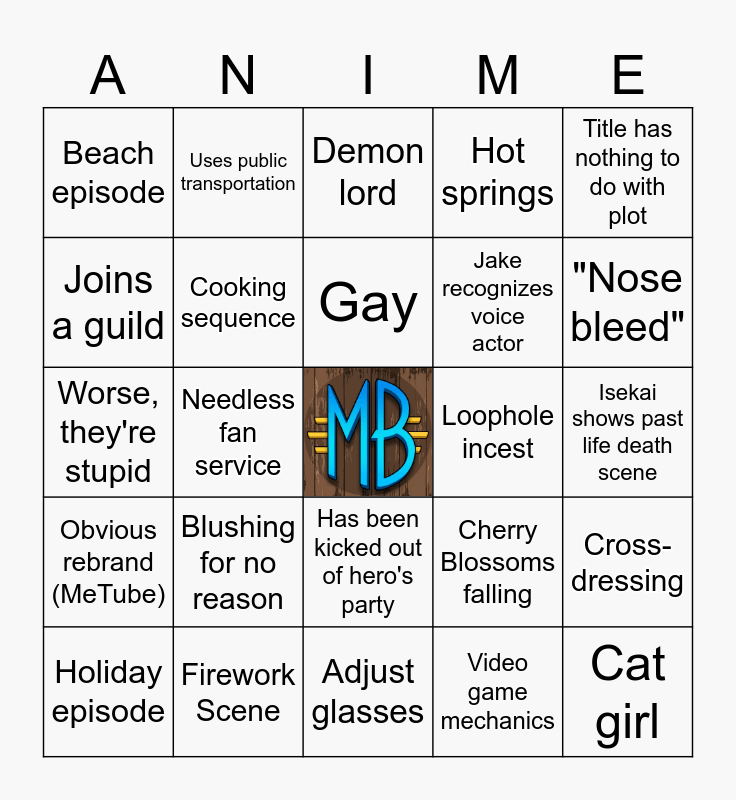 This bingo card has a free space and 48 words: It's a harem???, Cat girl, OP/ED sang by character voice actors, Adjust glasses, Blushing for no reason, Chibi scene, Uses public transportation, Enjoyed a dessert, Joins a guild, Title drop, Cooking sequence, Hot springs, Cross-dressing, Cherry Blossoms falling, No language barrier in new world, Almost kiss, Gay, Loophole incest, White Hair MC, Title has nothing to do with plot, Needless fan service, Video game mechanics, Beach episode, Jake recognizes voice actor, MC one-shots boss, "Nose bleed", Holiday episode, Training montage, Has been kicked out of hero's party, Obvious rebrand (MeTube), MC oblivious to crush, Oh, they have slaves, Has a familiar, Festival Episode, Firework Scene, Reverse Harem, Main character doesn't realize they are OP, Isekai shows past life death scene, Love confession, Political/War meeting, The church is against the MC, Karaoke, Demon lord, Favorite character death, Worse, they're stupid, Ramen, Character plays an instrument and Visits a shrine.