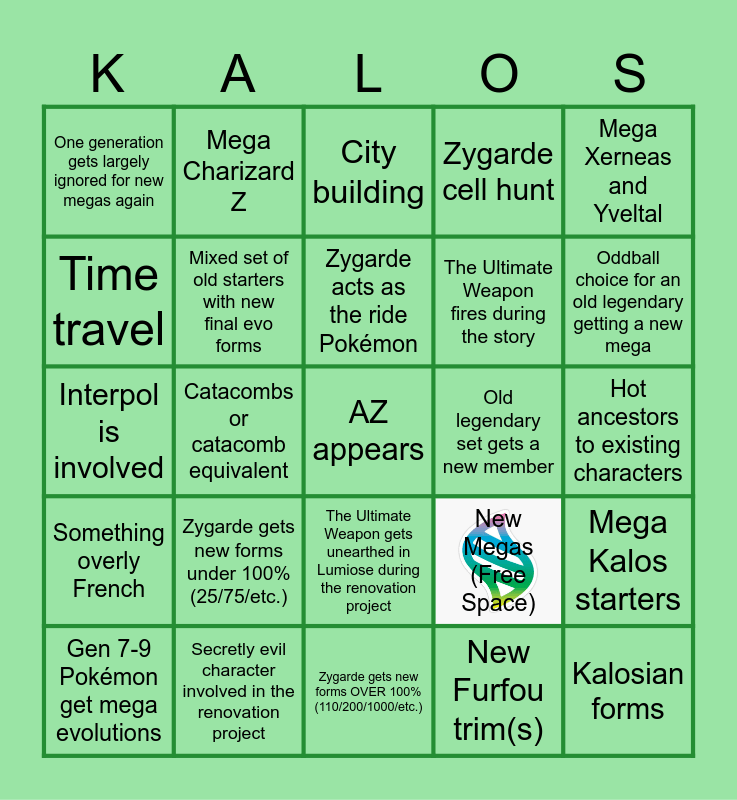 This bingo card has 1 images and 25 words: Zygarde gets new forms under 100% (25/75/etc.), Zygarde gets new forms OVER 100% (110/200/1000/etc.), Zygarde acts as the ride Pokémon, Gen 7-9 Pokémon get mega evolutions, Mega Xerneas and Yveltal, One generation gets largely ignored for new megas again, Time travel, Mega Charizard Z, Old legendary set gets a new member, The Ultimate Weapon gets unearthed in Lumiose during the renovation project, The Ultimate Weapon fires during the story, Interpol is involved, New Megas (Free Space), Mega Kalos starters, Mixed set of old starters with new final evo forms, Kalosian forms, Hot ancestors to existing characters, City building, Oddball choice for an old legendary getting a new mega, Catacombs or catacomb equivalent, AZ appears, Secretly evil character involved in the renovation project, Something overly French, Zygarde cell hunt and New Furfou trim(s).