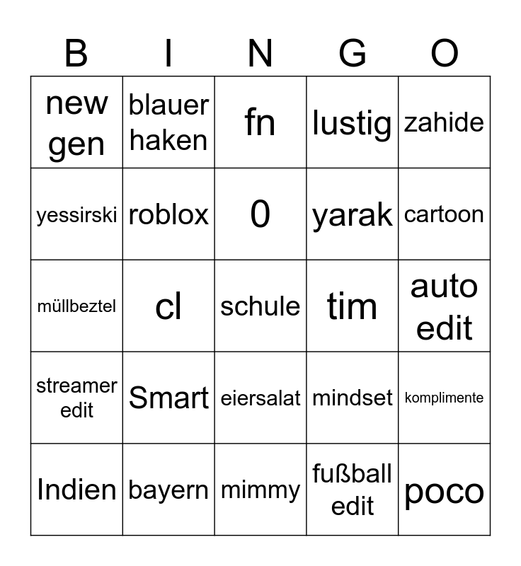 This bingo card has a free space and 24 words: Smart, bayern, 0, Indien, zahide, new gen, yessirski, blauer haken, tim, eiersalat, yarak, müllbeztel, mindset, komplimente, roblox, fußball edit, auto edit, fn, cartoon, cl, poco, streamer edit, lustig and mimmy.