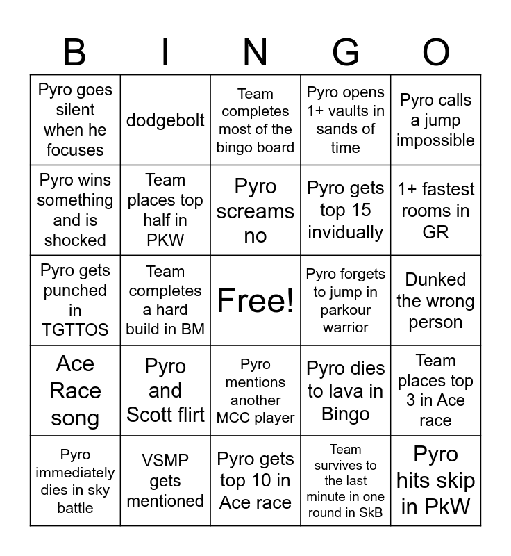 This bingo card has a free space and 24 words: Pyro and Scott flirt, VSMP gets mentioned, Pyro screams no, Pyro immediately dies in sky battle, Pyro calls a jump impossible, Pyro goes silent when he focuses, Pyro wins something and is shocked, dodgebolt, Pyro forgets to jump in parkour warrior, Pyro mentions another MCC player, Pyro gets top 15 invidually, Pyro gets punched in TGTTOS, Pyro dies to lava in Bingo, Team places top 3 in Ace race, Team places top half in PKW, Team survives to the last minute in one round in SkB, Dunked the wrong person, Team completes most of the bingo board, 1+ fastest rooms in GR, Team completes a hard build in BM, Pyro hits skip in PkW, Ace Race song, Pyro opens 1+ vaults in sands of time and Pyro gets top 10 in Ace race.