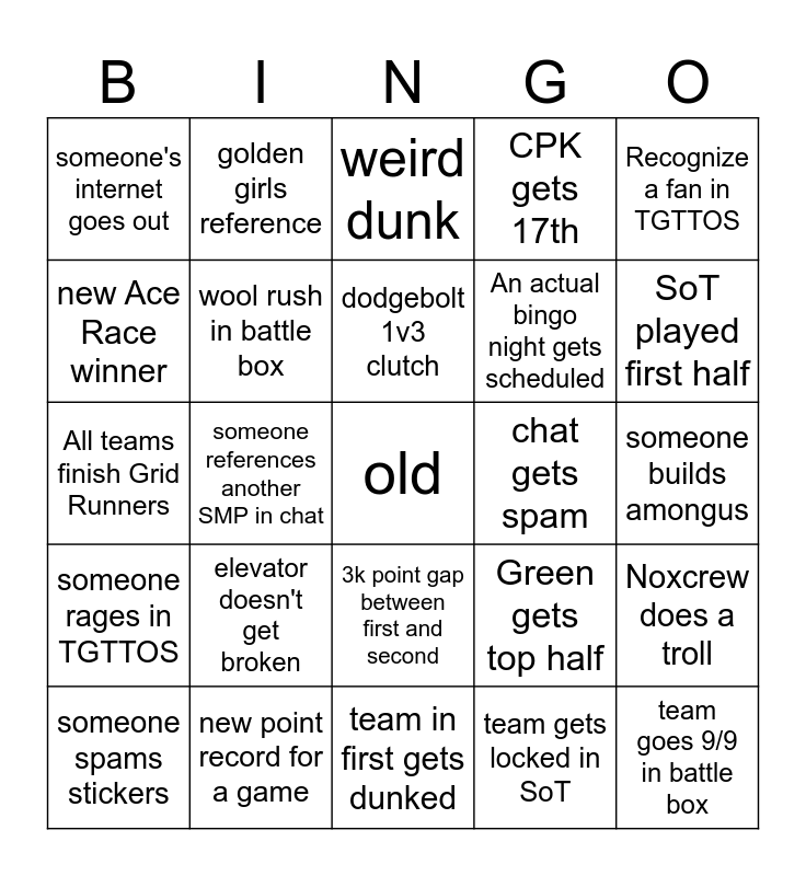 This bingo card has a free space and 29 words: someone spams stickers, swear in chat gets filtered, someone references another SMP in chat, yellow makes dodgebolt, someone's internet goes out, weird dunk, wool rush in battle box, elevator doesn't get broken, chat gets spam, new point record for a game, someone builds amongus, team goes 9/9 in battle box, team in first gets dunked, team gets locked in SoT, SoT played first half, Build Mart played second half, 3k point gap between first and second, someone rages in TGTTOS, Recognize a fan in TGTTOS, All teams finish Grid Runners, Green gets top half, background yaoi, An actual bingo night gets scheduled, new Ace Race winner, CPK gets 17th, golden girls reference, Noxcrew does a troll, dodgebolt 1v3 clutch and round 5 dodgebolt.