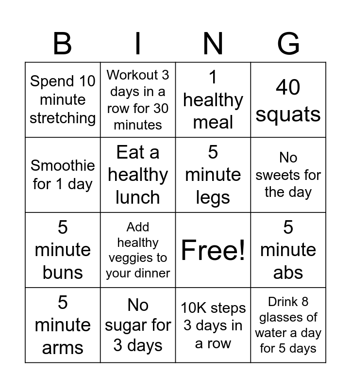 This bingo card has 16 words: No sugar for 3 days, 5 minute abs, 1 healthy meal, Spend 10 minute stretching, 5 minute buns, Workout 3 days in a row for 30 minutes, Free!, 10K steps 3 days in a row, Smoothie for 1 day, Eat a healthy lunch, 5 minute arms, 40 squats, Add healthy veggies to your dinner, No sweets for the day, 5 minute legs and Drink 8 glasses of water a day for 5 days.