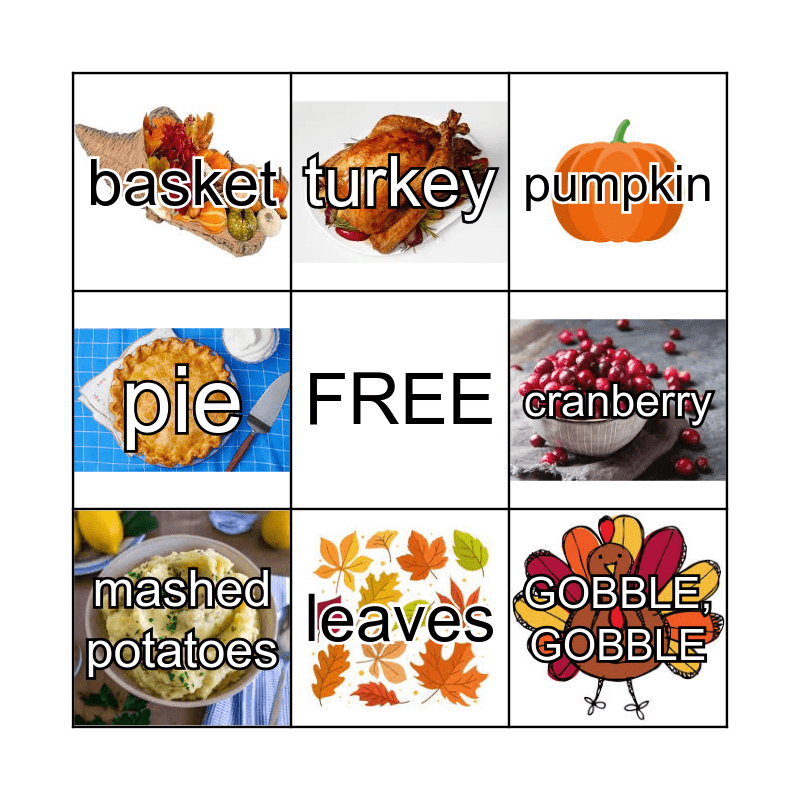 This bingo card has 8 images, a free space and 8 words: pie, turkey, cranberry, mashed potatoes, pumpkin, basket, leaves and GOBBLE, GOBBLE.