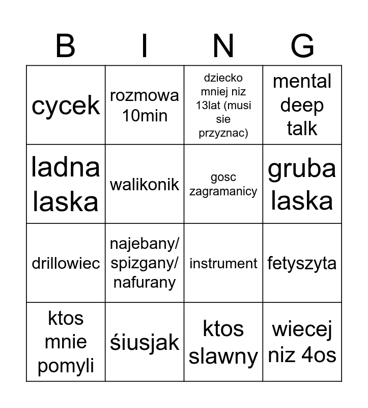 This bingo card has 16 words: śiusjak, fetyszyta, dziecko mniej niz 13lat (musi sie przyznac), cycek, drillowiec, rozmowa 10min, instrument, ktos slawny, ladna laska, walikonik, ktos mnie pomyli, mental deep talk, najebany/ spizgany/ nafurany, gruba laska, gosc zagramanicy and wiecej niz 4os.