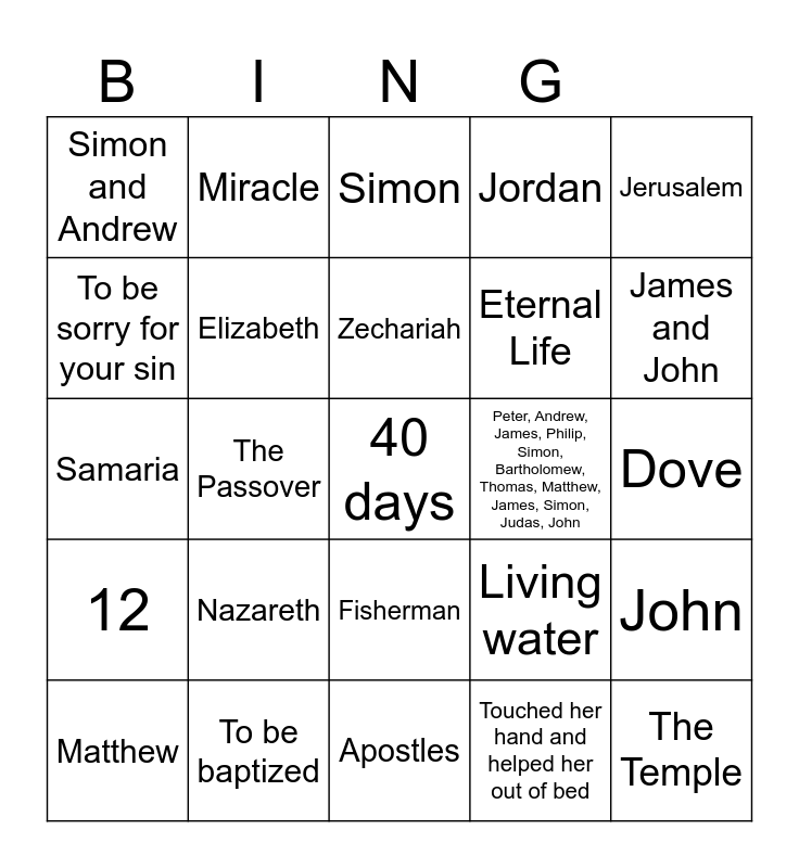 This bingo card has a free space and 37 words: Free!, Mary and Joseph, Bethlehem, Elizabeth, John, Nazareth, Zechariah, Messiah, Jerusalem, Savior, The Passover, Jordan, The Temple, Dove, To be sorry for your sin, 12, to turn away from sin, Simon, Fisherman, Peter, Andrew, James, Philip, Simon, Bartholomew, Thomas, Matthew, James, Simon, Judas, John, Simon and Andrew, James and John, Matthew, Apostles, Drove out an impure spirit, Touched her hand and helped her out of bed, Miracle, A scroll, Isaiah the Prophet, Drove him out of town, Nicodemus, To be baptized, Samaria, She was a Samaritan, Living water, Eternal Life and Many Samaritans in her town.