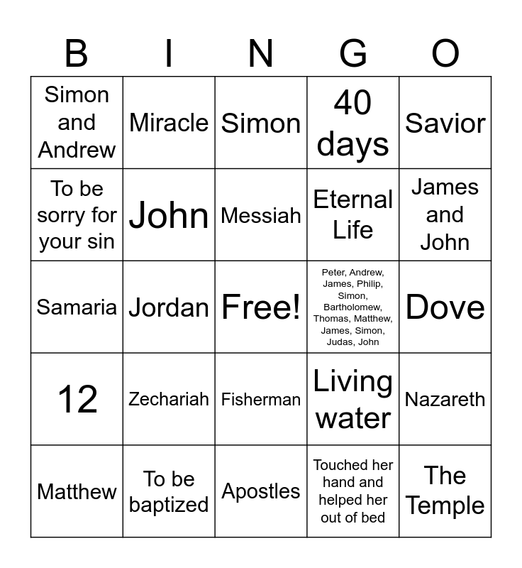 This bingo card has a free space and 37 words: Mary and Joseph, Bethlehem, Elizabeth, John, Nazareth, Zechariah, Messiah, Jerusalem, Savior, The Passover, Jordan, 40 days, The Temple, Dove, To be sorry for your sin, 12, to turn away from sin, Simon, Fisherman, Peter, Andrew, James, Philip, Simon, Bartholomew, Thomas, Matthew, James, Simon, Judas, John, Simon and Andrew, James and John, Matthew, Apostles, Drove out an impure spirit, Touched her hand and helped her out of bed, Miracle, A scroll, Isaiah the Prophet, Drove him out of town, Nicodemus, To be baptized, Samaria, She was a Samaritan, Living water, Eternal Life and Many Samaritans in her town.