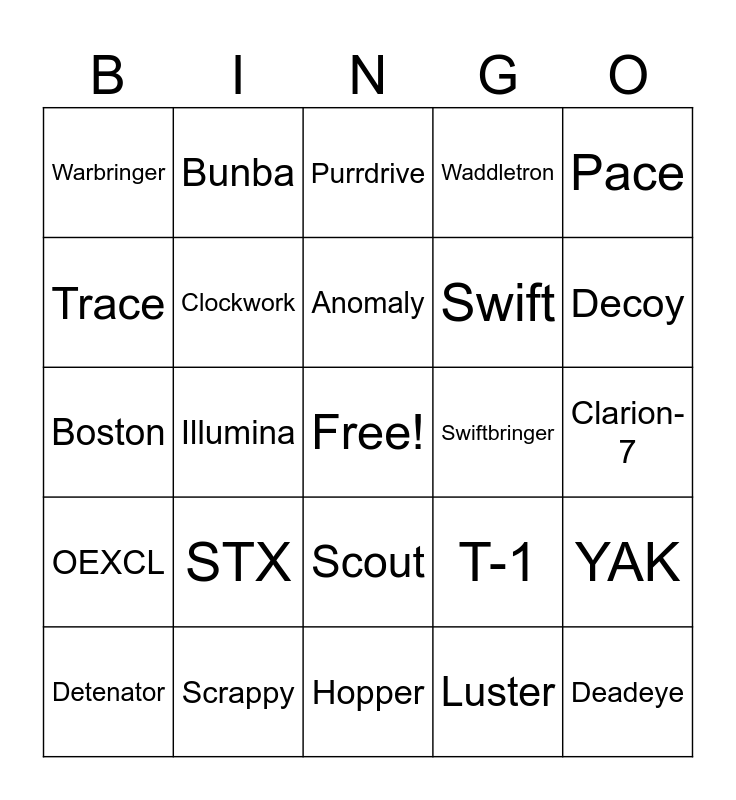This bingo card has a free space and 27 words: T-1, Deadnaught, Swift, Hopper, Trace, Purrdrive, Bunba, OEXCL, Swiftbringer, YAK, Boston, Waddletron, Detenator, Scrappy, Decoy, Glowtrix, Clockwork, Anomaly, STX, Warbringer, Clarion-7, Luster, Illumina, Deadeye, Scout, Pace and Flare.