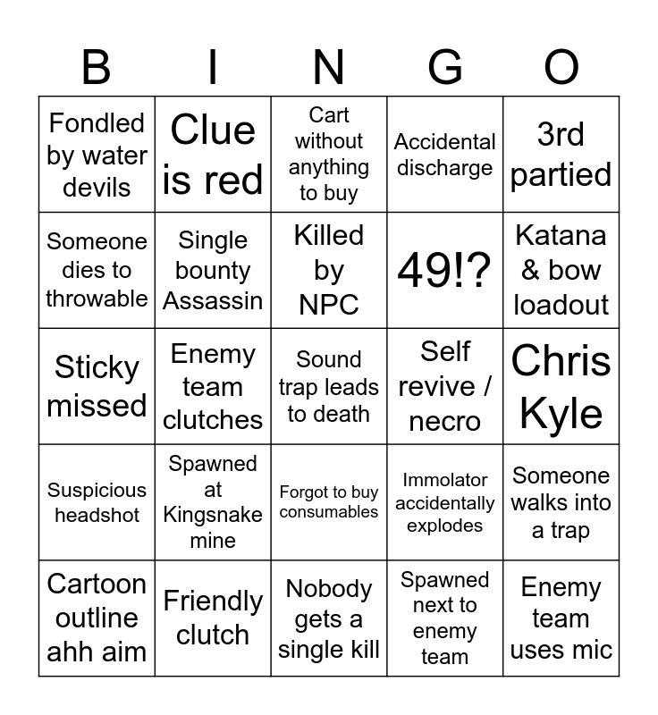This bingo card has a free space and 37 words: Free!, Back-to-back Desalle, Killed by bow, Single bounty Assassin, Someone walks into a trap, Spawned at Kingsnake mine, Killed by NPC, House plant, 3rd partied, Hunter retired, Enemy team clutches, Accidental discharge, Enemy team uses mic, Chris Kyle, Someone dies to throwable, Suspicious headshot, Melee kill, Cart without anything to buy, Forgot to buy consumables, Self revive / necro, Fondled by water devils, Katana & bow loadout, Cartoon outline ahh aim, Nobody gets a single kill, Rain, Spawned next to enemy team, Clue is red, PvE Match, Accidental Melee, Downed immediately after being revived, Found death cheat, Friendly clutch, Sticky missed, Gauntlet, Immolator accidentally explodes, 49!? and blue on blue incident.