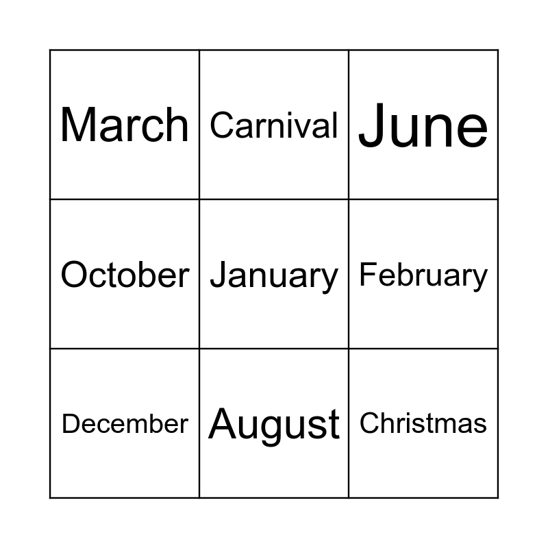 This bingo card has a free space and 8 words: February, June, Carnival, December, March, Christmas, October and August.