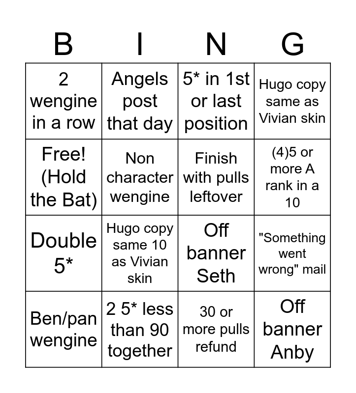 This bingo card has 16 words: 2 5* less than 90 together, "Something went wrong" mail, 5* in 1st or last position, 2 wengine in a row, Double 5*, Angels post that day, Off banner Seth, 30 or more pulls refund, Free! (Hold the Bat), Non character wengine, Ben/pan wengine, Hugo copy same as Vivian skin, Hugo copy same 10 as Vivian skin, (4)5 or more A rank in a 10, Finish with pulls leftover and Off banner Anby.