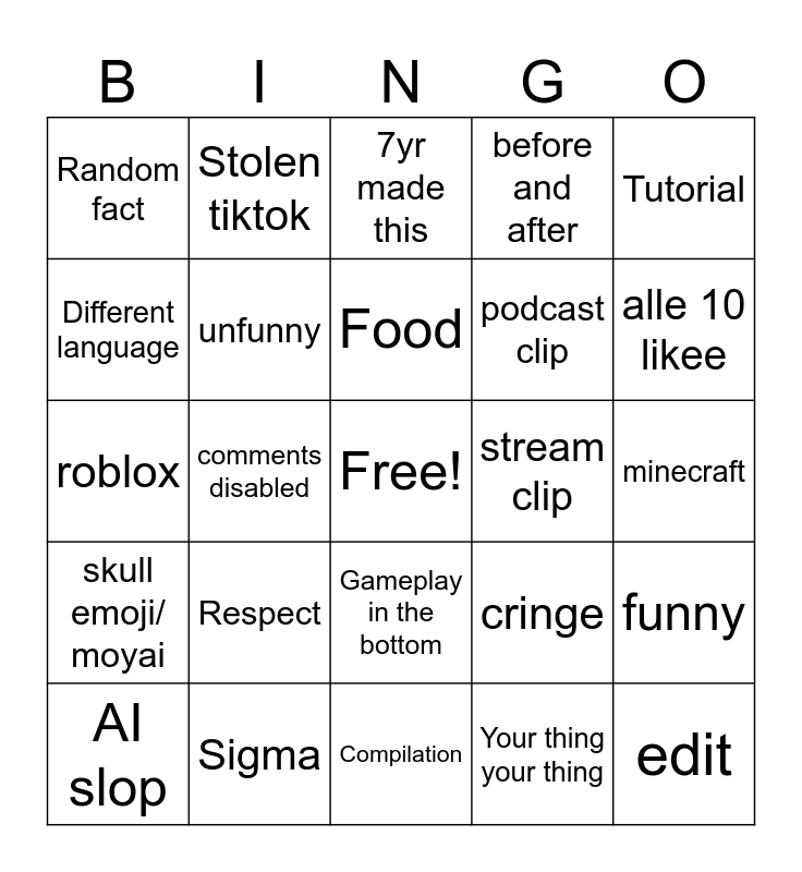 This bingo card has a free space and 24 words: Respect, Sigma, Food, AI slop, Tutorial, Random fact, Different language, Stolen tiktok, stream clip, Gameplay in the bottom, podcast clip, roblox, cringe, funny, unfunny, Your thing your thing, minecraft, 7yr made this, alle 10 likee, comments disabled, edit, skull emoji/ moyai, before and after and Compilation.