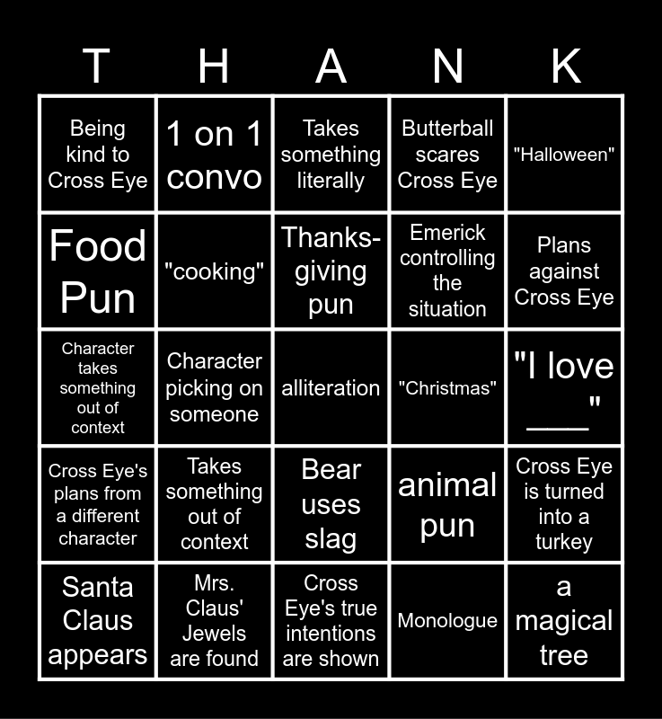 This bingo card has 30 words: Santa Claus appears, Butterball finds Cross Eye, Thanks-giving pun, Cross Eye says a metaphore, "Halloween", Being kind to Cross Eye, 1 on 1 convo, Bear uses slag, "Christmas", a magical tree, Cross Eye's plans from a different character, "cooking", Free!, Monologue, Cross Eye is turned into a turkey, "Easter", Character picking on someone, alliteration, animal pun, Plans against Cross Eye, Character takes something out of context, Mrs. Claus' Jewels are found, Takes something literally, Emerick controlling the situation, "I love ___", Food Pun, Takes something out of context, Cross Eye's true intentions are shown, Butterball scares Cross Eye and THANKS-GIVING DAY !!!.