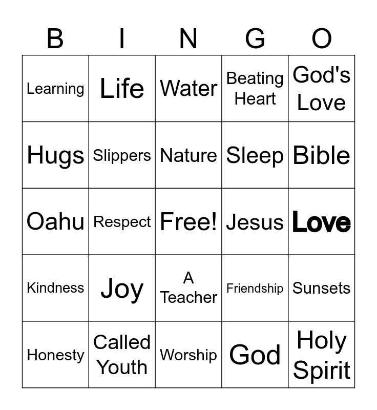 This bingo card has a free space and 29 words: Honesty, Beach, Respect, Family, Learning, Water, Slippers, Joy, Jesus, Called Youth, Love, Holy Spirit, Worship, God, Bible, Food, A Teacher, Kindness, God's Love, Oahu, Friendship, Music, Sleep, Hugs, Beating Heart, Life, Sunsets, Nature and Sports.