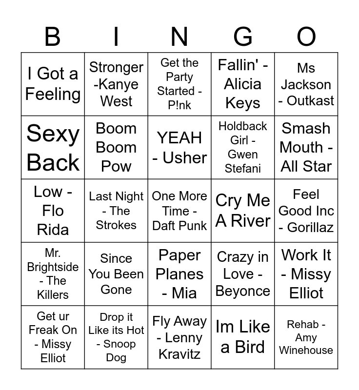 This bingo card has 25 words: Since You Been Gone, Fly Away - Lenny Kravitz, YEAH - Usher, Get ur Freak On - Missy Elliot, Ms Jackson - Outkast, I Got a Feeling, Sexy Back, Stronger -Kanye West, Cry Me A River, Paper Planes - Mia, Holdback Girl - Gwen Stefani, Low - Flo Rida, Crazy in Love - Beyonce, Work It - Missy Elliot, Boom Boom Pow, Rehab - Amy Winehouse, Feel Good Inc - Gorillaz, Get the Party Started - P!nk, Smash Mouth - All Star, Last Night - The Strokes, One More Time - Daft Punk, Drop it Like its Hot - Snoop Dog, Mr. Brightside - The Killers, Fallin' - Alicia Keys and Im Like a Bird.
