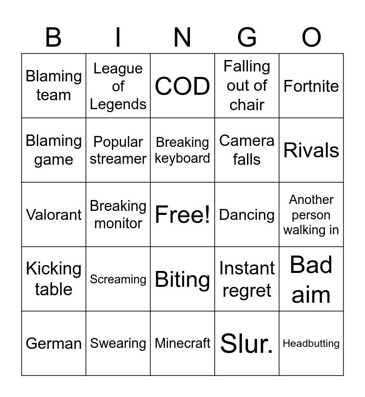 This bingo card has a free space and 24 words: Screaming, Swearing, Breaking keyboard, German, Fortnite, Blaming team, Blaming game, League of Legends, Dancing, Biting, Camera falls, Valorant, Instant regret, Bad aim, Popular streamer, Slur., Another person walking in, COD, Rivals, Breaking monitor, Headbutting, Kicking table, Falling out of chair and Minecraft.