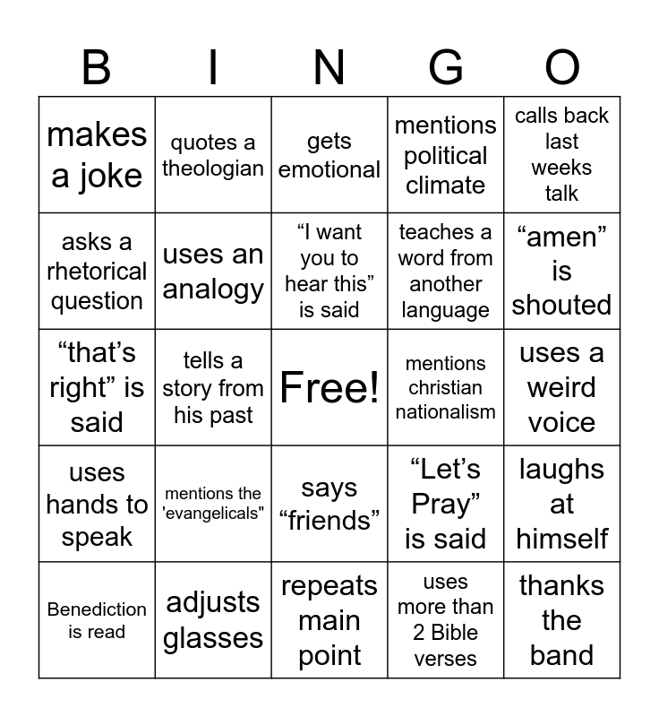 This bingo card has a free space and 24 words: mentions the 'evangelicals", adjusts glasses, “I want you to hear this” is said, Benediction is read, calls back last weeks talk, makes a joke, asks a rhetorical question, quotes a theologian, mentions christian nationalism, says “friends”, teaches a word from another language, “that’s right” is said, “Let’s Pray” is said, laughs at himself, uses an analogy, uses more than 2 Bible verses, uses a weird voice, gets emotional, “amen” is shouted, tells a story from his past, thanks the band, uses hands to speak, mentions political climate and repeats main point.