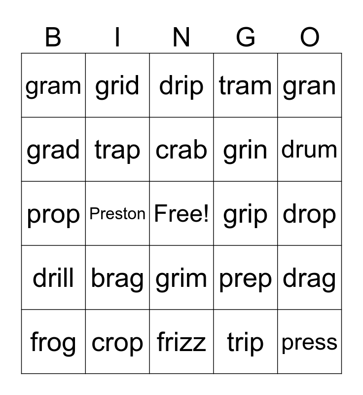 This bingo card has a free space and 24 words: brag, crop, crab, frog, gran, gram, grad, grid, grip, grim, grin, prop, prep, drag, trap, trip, drop, drip, drum, Preston, press, drill, tram and frizz.