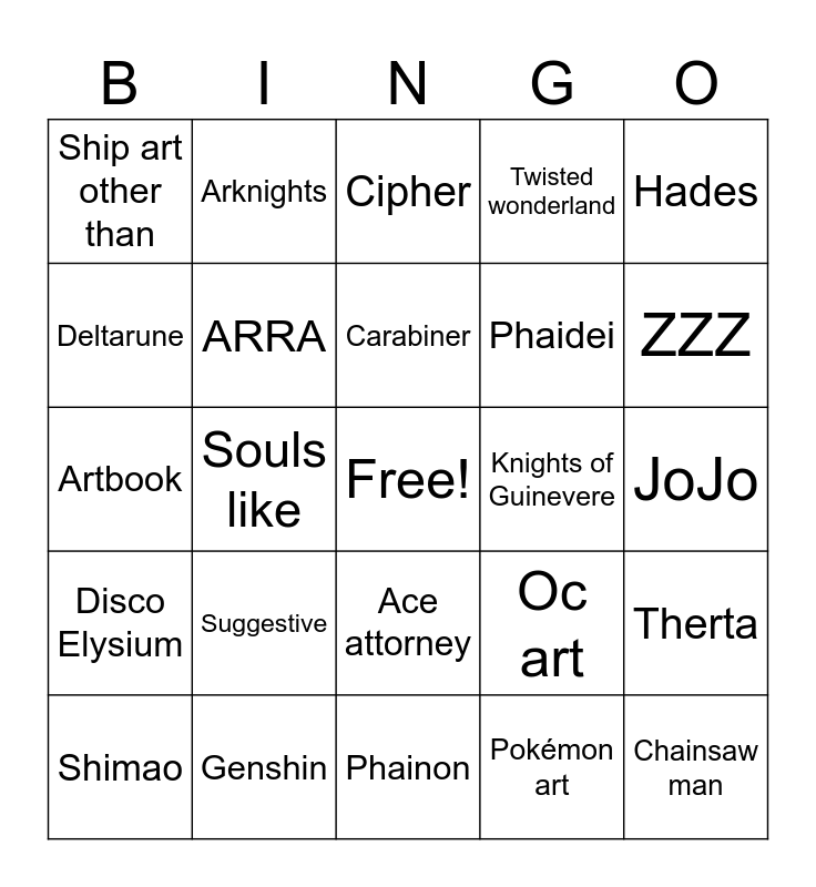 This bingo card has a free space and 24 words: Suggestive, Genshin, Carabiner, Shimao, Hades, Ship art other than, Deltarune, Arknights, Knights of Guinevere, Ace attorney, Phaidei, Artbook, Oc art, Therta, ARRA, Pokémon art, JoJo, Cipher, ZZZ, Souls like, Chainsaw man, Disco Elysium, Twisted wonderland and Phainon.
