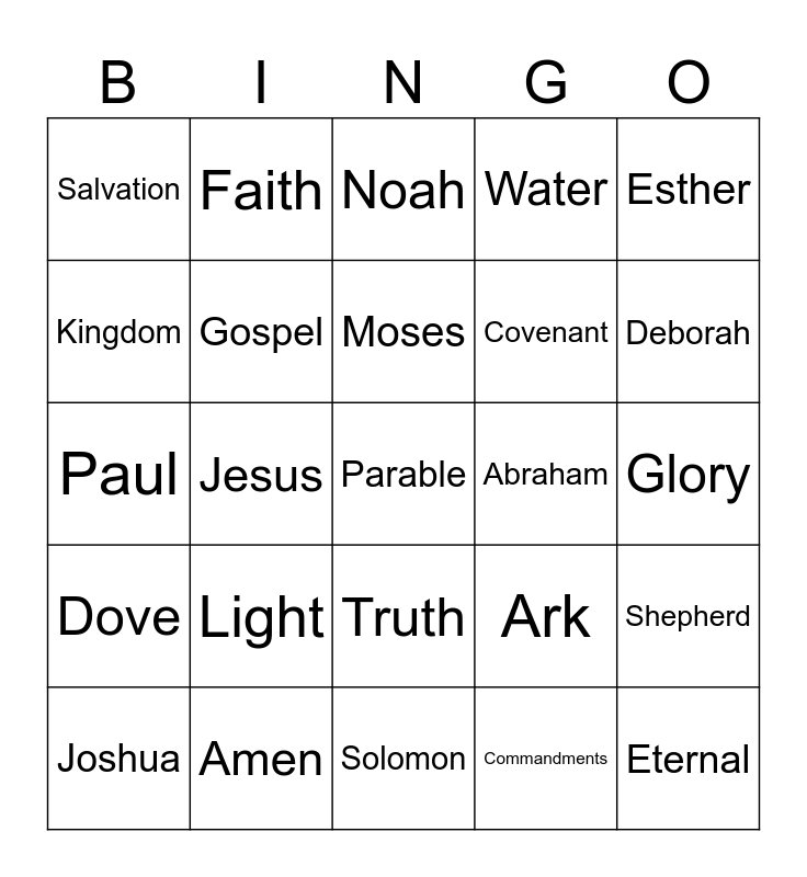 This bingo card has 50 words: Hallelujah, Amen, Praise, Worship, Glory, Hosanna, Faith, Spirit, Covenant, Grace, Salvation, Gospel, Parable, Commandments, Promise, Blessing, Jesus, Moses, David, Esther, Paul, Mary, Noah, Abraham, Cross, Dove, Light, Bread, Water, Shepherd, Star, Crown, Peter, John, Ruth, Joshua, Elijah, Solomon, Timothy, Deborah, Mercy, Redemption, Truth, Prophecy, Eternal, Kingdom, Disciple, Miracle, Ark and Trumpet.