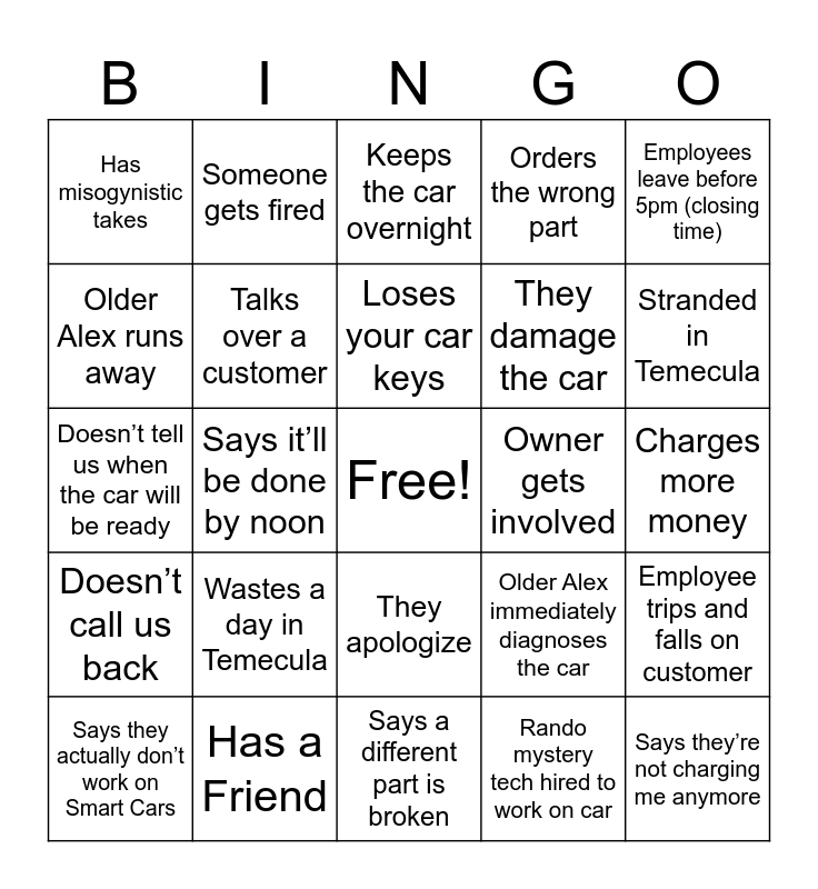 This bingo card has a free space and 30 words: Has a Friend, Says it’ll be done by tomorrow, Says it’ll be done by noon, Straight up lies, Has misogynistic takes, Keeps the car overnight, Talks over a customer, They apologize, Owner gets involved, Says a different part is broken, Charges more money, Says they’re not charging me anymore, Rando mystery tech hired to work on car, Delivery person couldn’t make it, Stranded in Temecula, They provide an offering, Older Alex immediately diagnoses the car, Doesn’t call us back, Wastes a day in Temecula, Employees leave before 5pm (closing time), Doesn’t tell us when the car will be ready, Rando co-workers pipe in, Someone gets fired, They damage the car, Older Alex runs away, Orders the wrong part, Employee trips and falls on customer, Says they actually don’t work on Smart Cars, Loses your car keys and Personal things in the vehicle are missing.