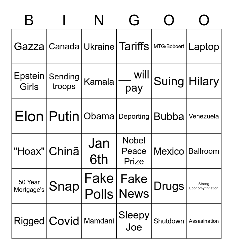 This bingo card has 36 words: Fake News, Fake Polls, Sleepy Joe, Epstein Girls, "Hoax", Deporting, Sending troops, Mamdani, MTG/Boboert, Drugs, Hilary, Tariffs, Strong Economy/Inflation, Putin, __ will pay, Gazza, 50 Year Mortgage's, Bubba, Elon, Ukraine, Obama, Chinã, Nobel Peace Prize, Jan 6th, Mexico, Canada, Suing, Covid, Kamala, Laptop, Assasination, Rigged, Ballroom, Venezuela, Snap and Shutdown.