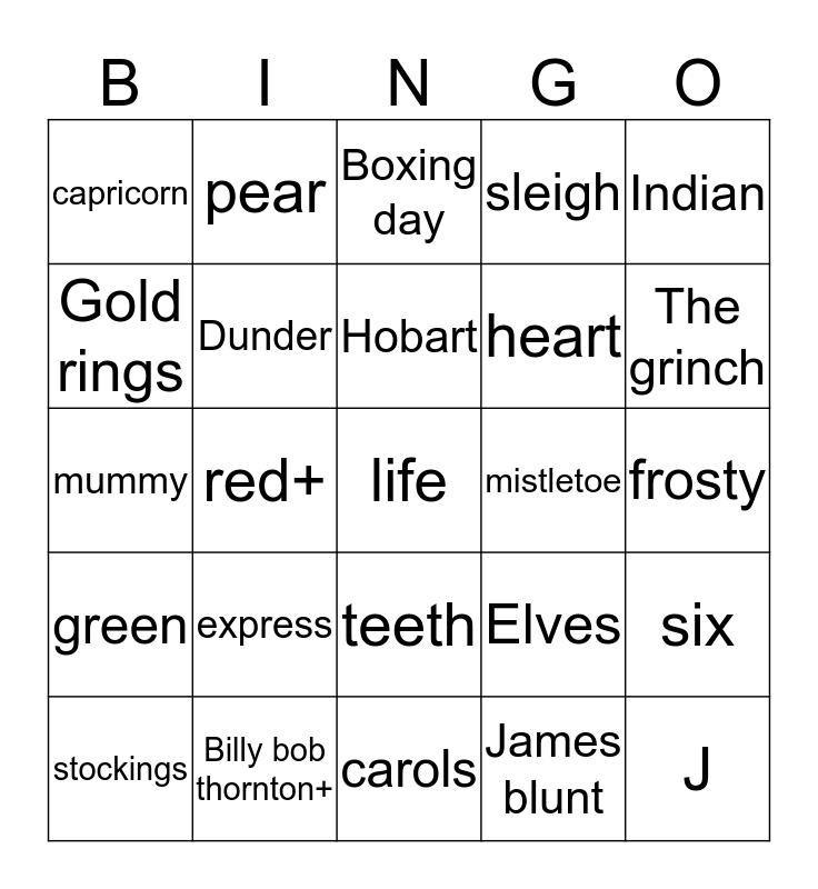 This bingo card has 36 words: 1974, Blitzen, Chimney, Dunder, Elves, green, Hobart, Kris Kringle, Indian, manger, red+, sleigh, Tinsel, mistletoe, The grinch, capricorn, J, express, life, Boxing day, frosty, six, Billy bob thornton+, stockings, carols, pear, mummy, 12, heart, Gold rings, Holy night, stephen, James blunt, teeth, 25 December and sunday.