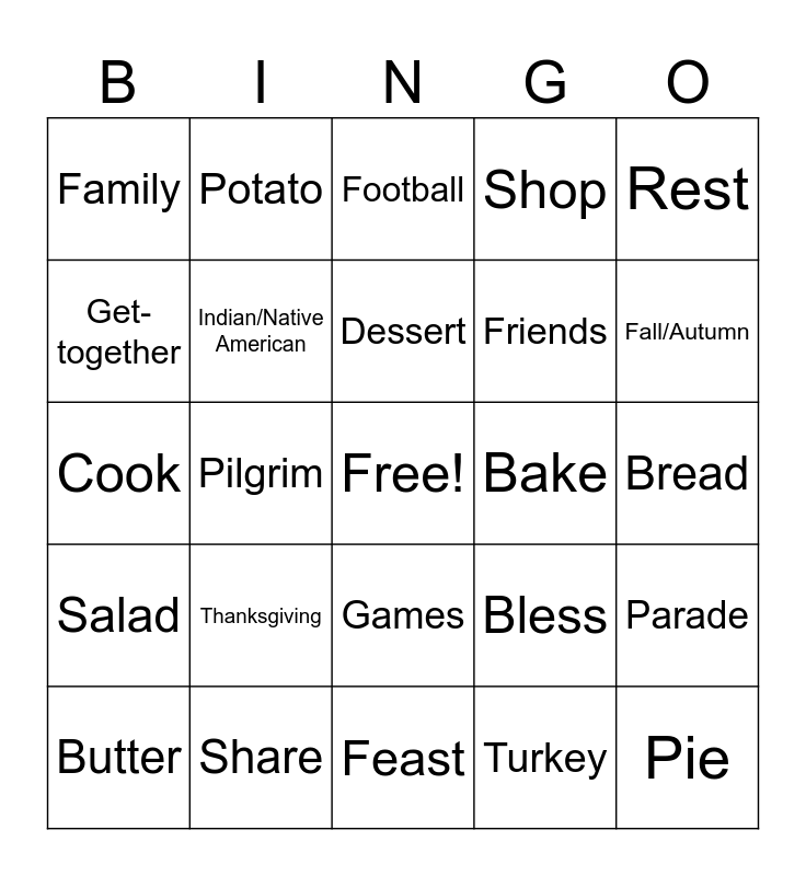This bingo card has a free space and 24 words: Thanksgiving, Share, Dessert, Butter, Rest, Family, Get-together, Potato, Bake, Games, Friends, Cook, Bless, Parade, Indian/Native American, Turkey, Bread, Football, Fall/Autumn, Pilgrim, Pie, Salad, Shop and Feast.