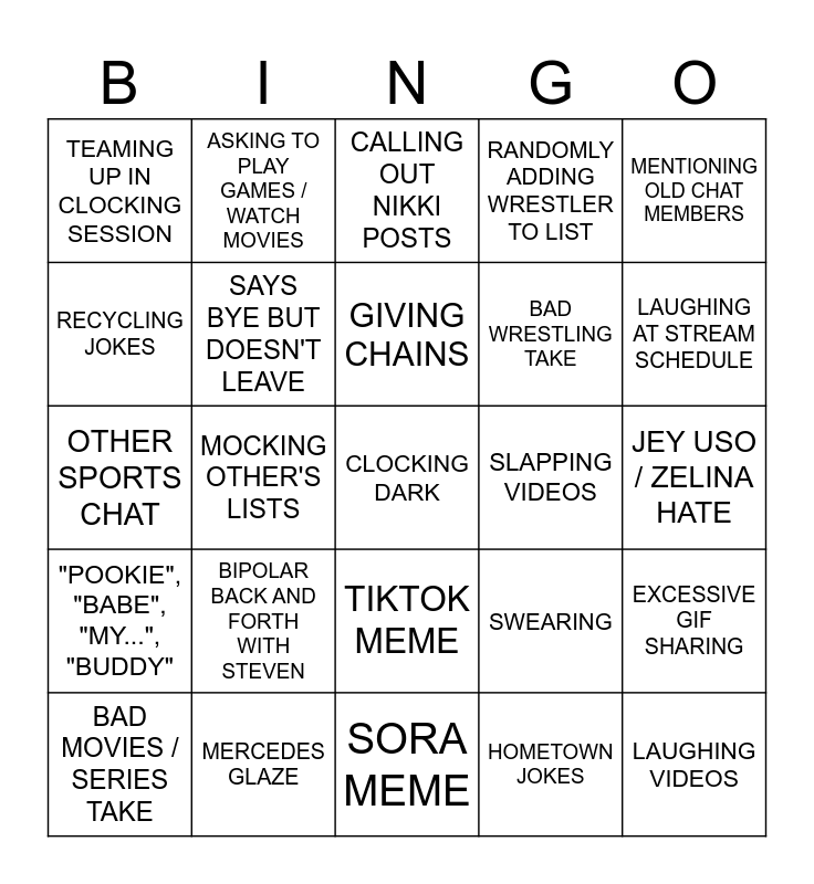 This bingo card has a free space and 24 words: BIPOLAR BACK AND FORTH WITH STEVEN, MERCEDES GLAZE, GIVING CHAINS, BAD MOVIES / SERIES TAKE, MENTIONING OLD CHAT MEMBERS, TEAMING UP IN CLOCKING SESSION, RECYCLING JOKES, ASKING TO PLAY GAMES / WATCH MOVIES, SLAPPING VIDEOS, TIKTOK MEME, BAD WRESTLING TAKE, OTHER SPORTS CHAT, SWEARING, EXCESSIVE GIF SHARING, SAYS BYE BUT DOESN'T LEAVE, HOMETOWN JOKES, JEY USO / ZELINA HATE, CALLING OUT NIKKI POSTS, LAUGHING AT STREAM SCHEDULE, MOCKING OTHER'S LISTS, LAUGHING VIDEOS, "POOKIE", "BABE", "MY...", "BUDDY", RANDOMLY ADDING WRESTLER TO LIST and SORA MEME.