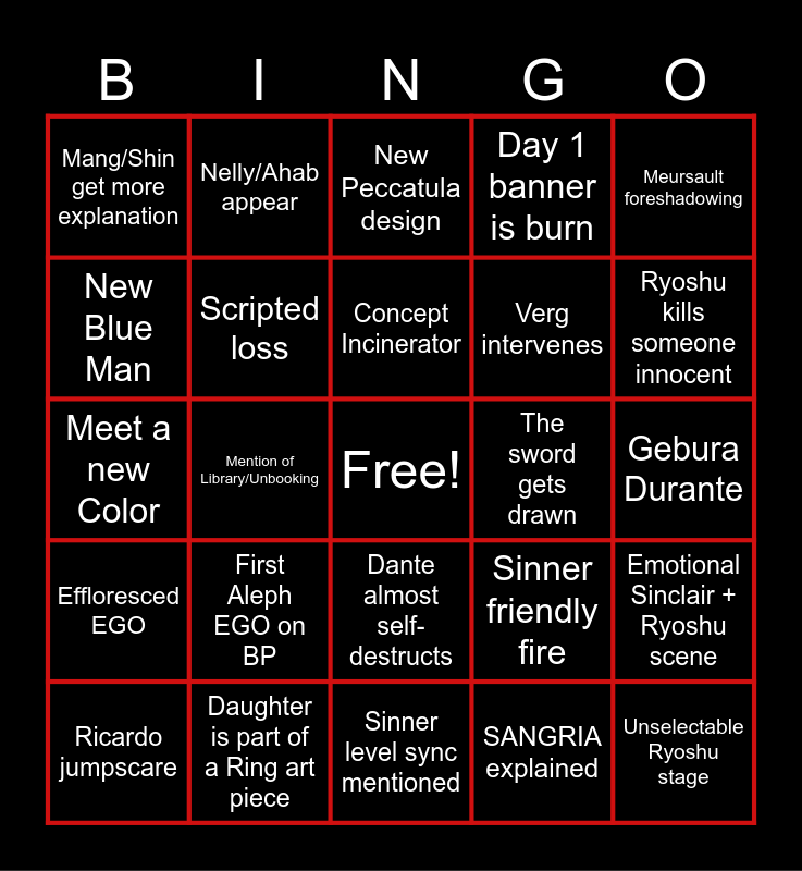 This bingo card has a free space and 24 words: First Aleph EGO on BP, Daughter is part of a Ring art piece, Concept Incinerator, Ricardo jumpscare, Meursault foreshadowing, Mang/Shin get more explanation, New Blue Man, Nelly/Ahab appear, The sword gets drawn, Dante almost self-destructs, Verg intervenes, Meet a new Color, Sinner friendly fire, Emotional Sinclair + Ryoshu scene, Scripted loss, SANGRIA explained, Gebura Durante, New Peccatula design, Ryoshu kills someone innocent, Mention of Library/Unbooking, Unselectable Ryoshu stage, Effloresced EGO, Day 1 banner is burn and Sinner level sync mentioned.