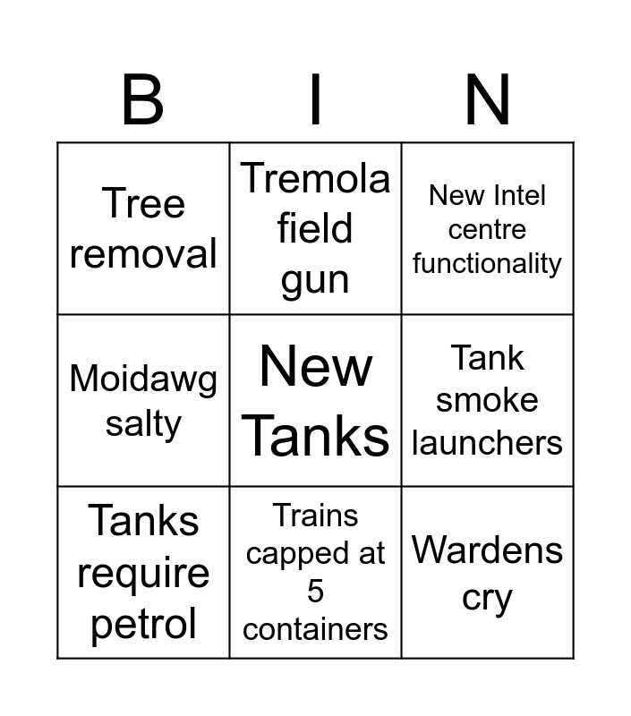 This bingo card has a free space and 24 words: Coal resource, Warden dev bias joke, Trains capped at 5 containers, Devs mentions the leak, Wardens cry, Tree removal, Tank smoke launchers, Tremola field gun, Rail requires gsups, ISG nerfed, Infantry rework, Sniper rifles reverted, New ACs, Weather bunker, Tanks require petrol, Flamethrowers, Electricity, New Intel centre functionality, Hoplite reworked, New tmat tier, Plastic resource, Stream starts late, Moidawg salty and 1 MBT per MPF crate.