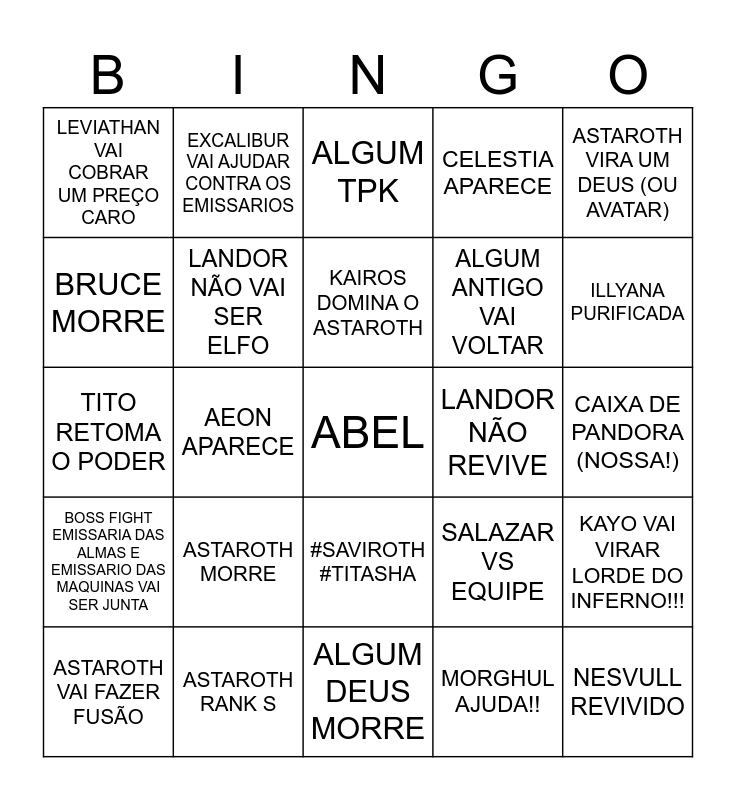 This bingo card has a free space and 24 words: ASTAROTH MORRE, ASTAROTH RANK S, KAIROS DOMINA O ASTAROTH, ASTAROTH VAI FAZER FUSÃO, ASTAROTH VIRA UM DEUS (OU AVATAR), LEVIATHAN VAI COBRAR UM PREÇO CARO, BRUCE MORRE, EXCALIBUR VAI AJUDAR CONTRA OS EMISSARIOS, LANDOR NÃO REVIVE, #SAVIROTH #TITASHA, ALGUM ANTIGO VAI VOLTAR, TITO RETOMA O PODER, SALAZAR VS EQUIPE, KAYO VAI VIRAR LORDE DO INFERNO!!!, LANDOR NÃO VAI SER ELFO, MORGHUL AJUDA!!, CAIXA DE PANDORA (NOSSA!), ALGUM TPK, ILLYANA PURIFICADA, AEON APARECE, NESVULL REVIVIDO, BOSS FIGHT EMISSARIA DAS ALMAS E EMISSARIO DAS MAQUINAS VAI SER JUNTA, CELESTIA APARECE and ALGUM DEUS MORRE.