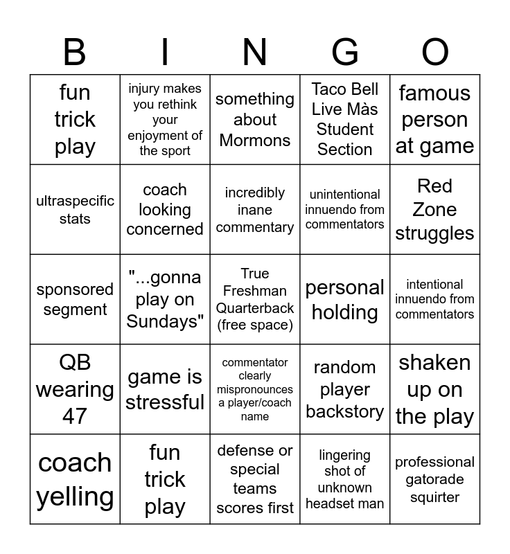 This bingo card has a free space and 28 words: shaken up on the play, band sighting, unintentional innuendo from commentators, lingering shot of unknown headset man, ultraspecific stats, something about Mormons, injury makes you rethink your enjoyment of the sport, QB wearing 47, personal holding, coach yelling, sponsored segment, Taco Bell Live Màs Student Section, fun trick play, defense or special teams scores first, Red Zone struggles, "you really don't want to put yourself in that situation", game is stressful, coach looking concerned, incredibly inane commentary, commentator clearly mispronounces a player/coach name, fun trick play, defense does something crazy, professional gatorade squirter, "...gonna play on Sundays", intentional innuendo from commentators, random player backstory, famous person at game and receiver drops ball.